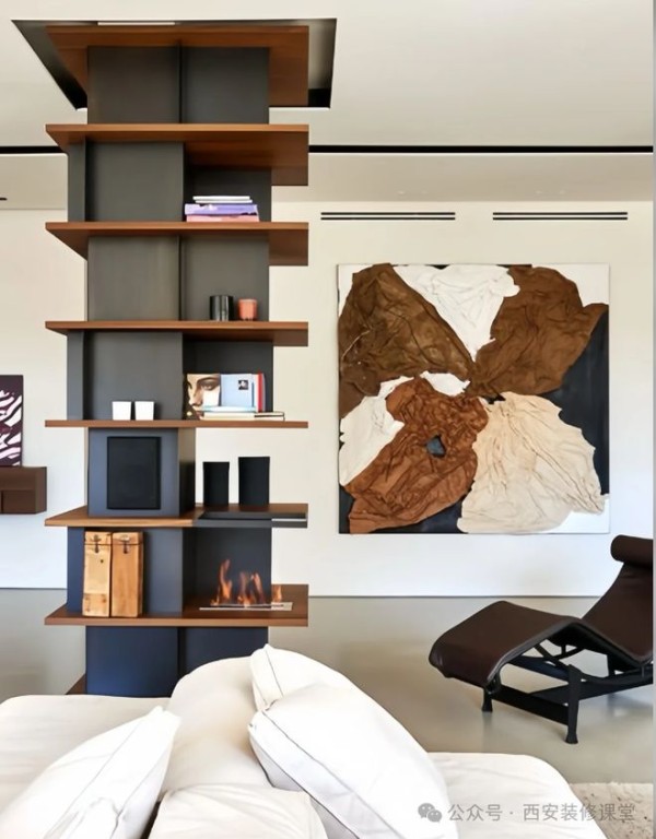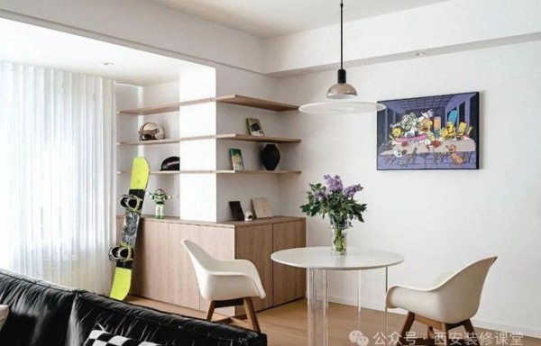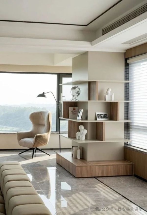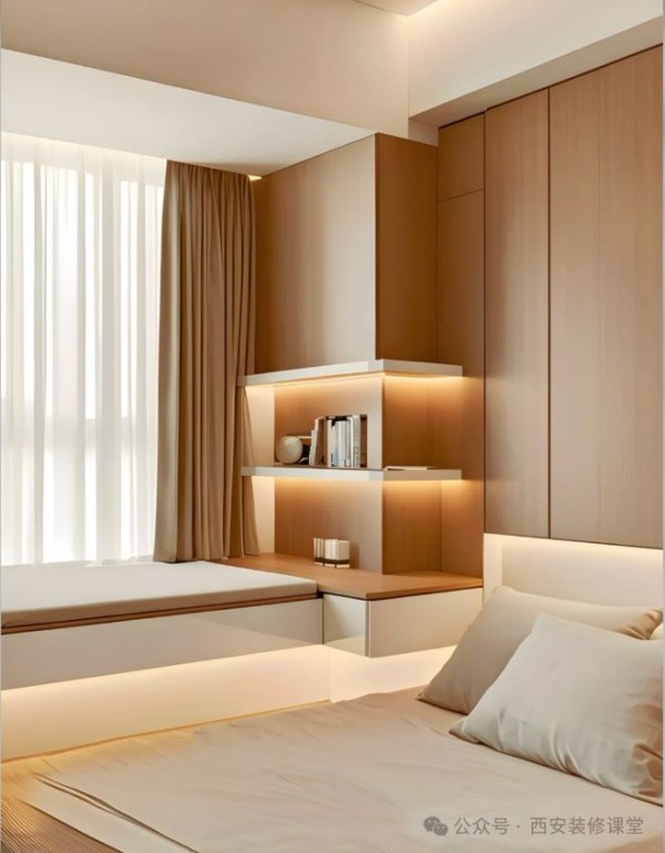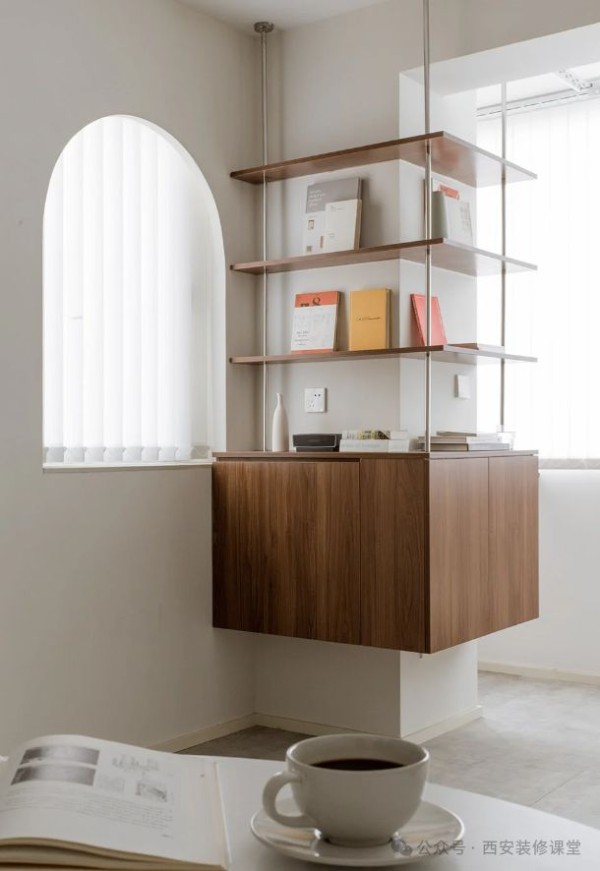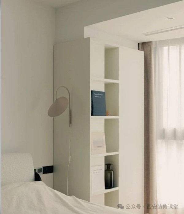 如图利用卧室超大的柱子转角设计一个收纳柜,加上镂空开放格以及上方留白,视觉上弱化柱子的存在,同时满足收纳,空间也更有了设计感