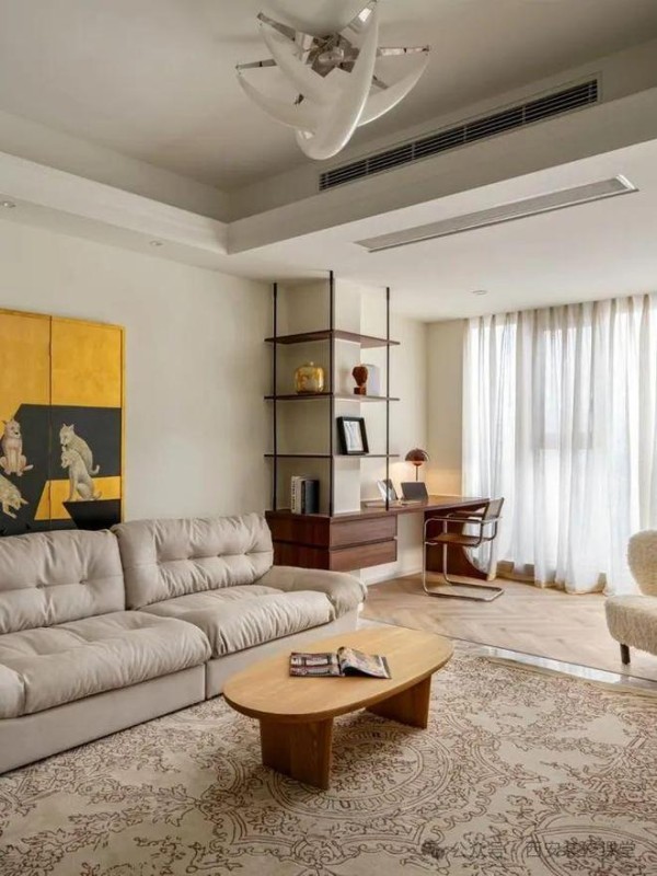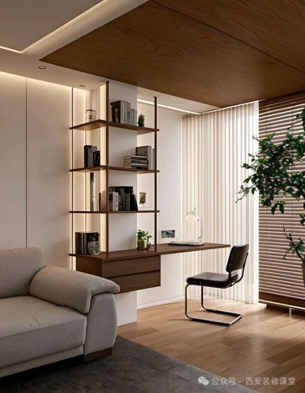 如图客厅与阳台的承重柱子无法拆除,采用书桌定制与转角设计结合的形式,上方置物架满足展示,弱化柱子的突兀,提升空间的高级感