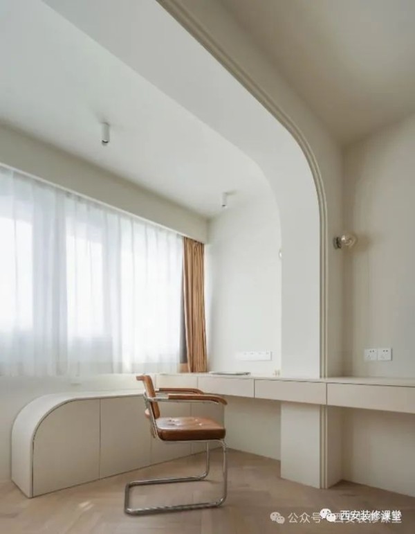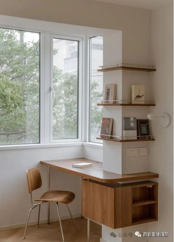 如图卧室有个承重墙垛柱子,采用书桌延伸穿插的形式,满足视觉延伸成就功能,弱化了柱子的突兀,同时实现空间的连贯