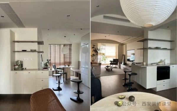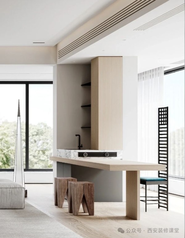 突兀难看的柱子,采用木质装饰延伸,满足一个展示壁龛,同时利用岛台餐桌的结合,实现一个最美的休闲茶室功能《》
