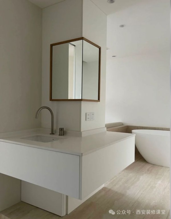 卫生间利用承重柱转角定制悬空浴柜,转角镜子,实现功能,而且弱化柜子的存在感,同时空间变得更加高级