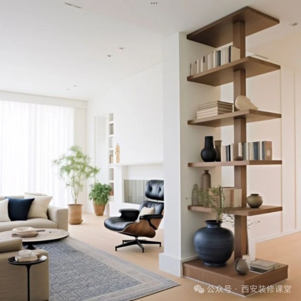 墙角很大的承重柱子利用转角收纳柜以及转角的展示置物架, 弱化突兀感,满足收纳同时提升空间的高级感