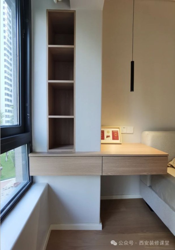 卧室墙角承重墙柱,采用转角书桌悬空定制,同时利用镂空满足一个置物空间,弱化柱子的突兀,同时满足设计感