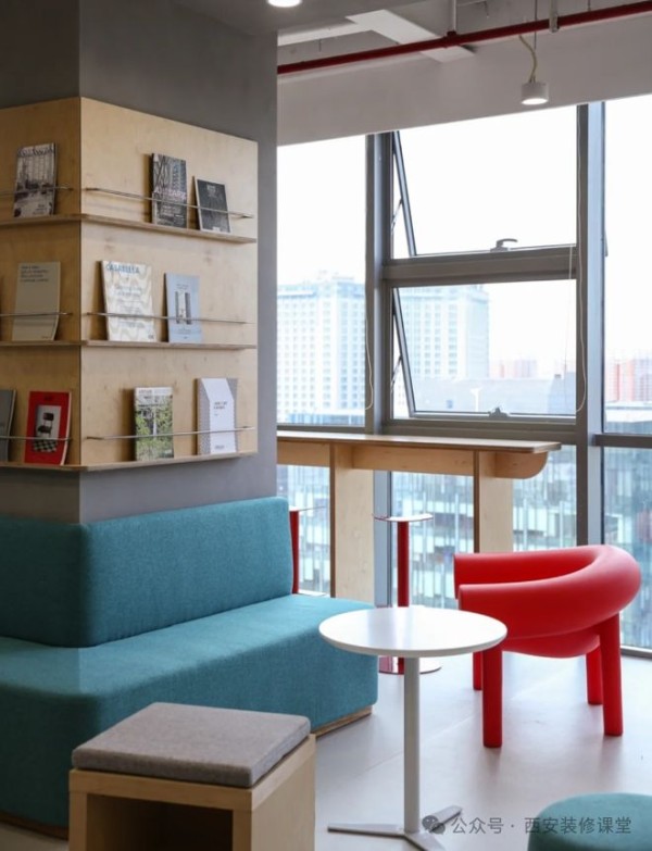 碍眼的柱子转角设计卡座,上方超薄的杂志架满足书籍收纳,实现最美的休闲角落