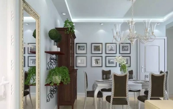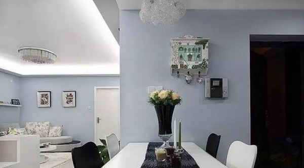 常见的餐厅墙面装饰,多挂这简单装饰画。为了迎合时尚简约的家居空间,淡蓝色的墙面上,铺贴着黑色相框,让空间更具文艺气息。