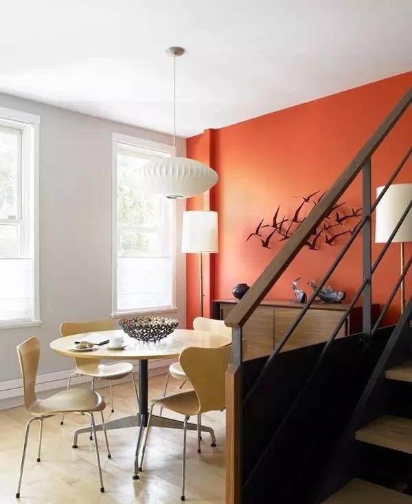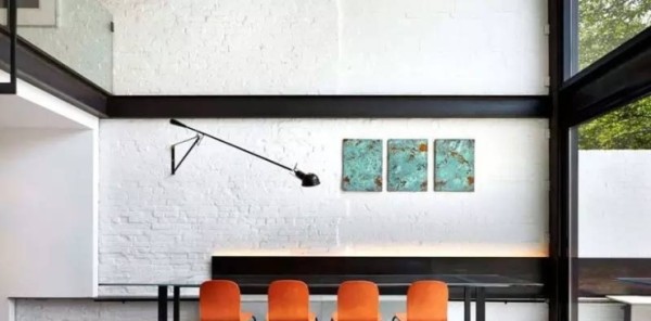 如果偏爱怀旧风,不妨直接用个性的文化石进行装点。纯白的家中,黑色餐椅与靠墙座椅几乎融为一体,橙色座椅与蓝色装饰画,成为空间调味剂。