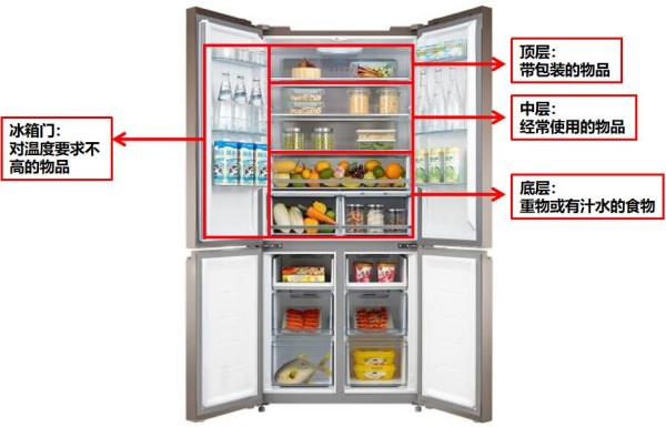 冰箱不论大小分区收纳都是很重要的,就冷藏区来说,最顶层可以收纳饮料、护肤品等带包装的物品;中间层收纳经常使用的物品;底层收纳较重或有汁水的食物、蔬菜等。冰箱门适合放对温度要求不高的食材,如调味料、酱菜等,也可以将饮料放在这边。