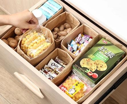 冷藏区抽屉一般都是比较深的,如果随意堆放就会使放在最下面的物品不易拿取。我们可以用牛皮纸在进行抽屉的分隔,因为牛皮纸尺寸多样,高度还可以随意调节,灵活实用还超级便宜哦~外面再套个保鲜袋,防止蔬果水分流失。