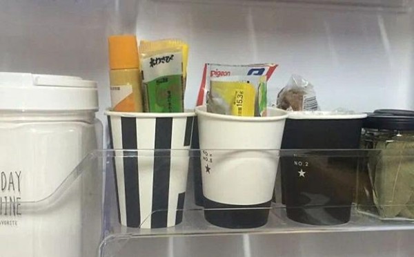 冰箱门上经常会放一些小而杂的物品, 直接放就会很乱,这时我们可以用一次性纸杯来分类存放不同物品。