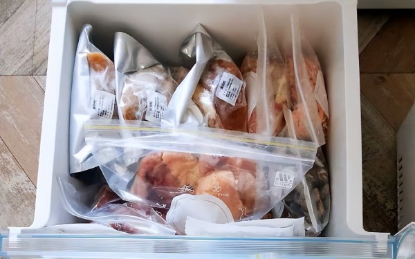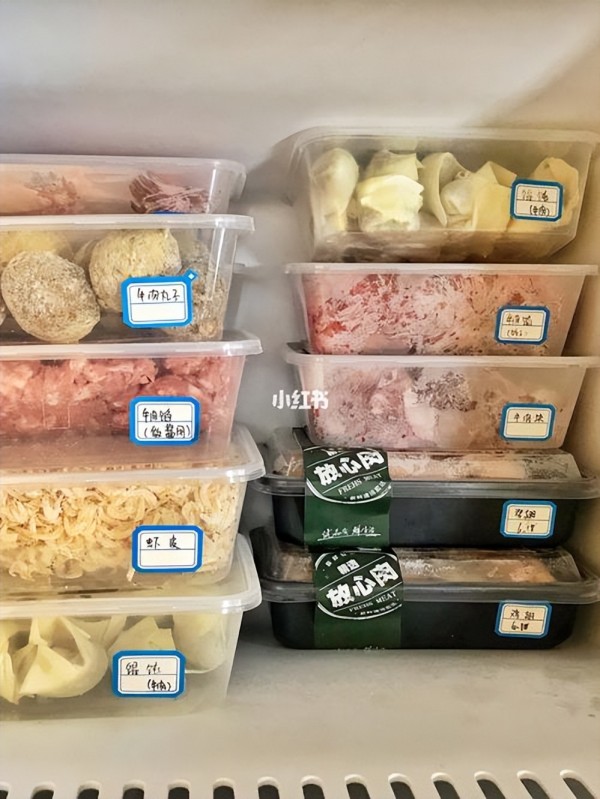 我们在收纳需要冷冻的食物前可以先将保质期较短的食物存放在容易拿取的区域。如果是自己处理过的半成品食品可以用保鲜盒收纳,并在保鲜盒上用标签贴上冷冻日期,方便下次使用。