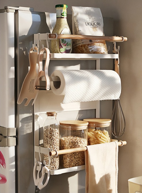 1、冰箱侧面也要利用好,我们可以在网上购买一个磁吸收纳架,用来收纳小杂物,比如厨房用纸、保鲜膜、果皮刀、剪刀之类。方便食物放入冰箱前进行简单处理,也充分利用了厨房的空间。