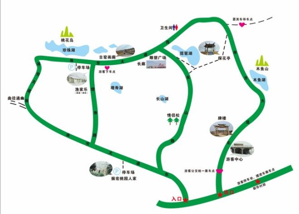 进入景区后,若不想步行,可选择乘坐活动摆渡车游览。图中标注了集中下车点。在欣赏桃花美景的同时,逛逛集市,品尝特色美食,感受当地风情,最后统一在“桃宝”集市点乘车返回。