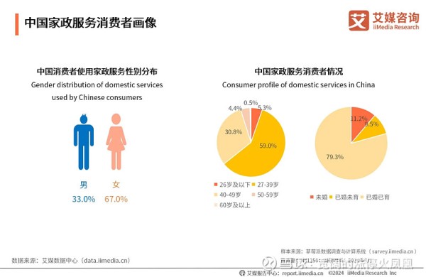 iiMedia Research(艾媒咨询)数据显示,2024年中国消费者使用过家政服务的女性占比较高,达到67.0%;27-39岁的中青年群体与已婚已育人群是家政服务消费的主力军,占比分别达59.0%和79.3%。艾媒咨询分析师认为,家政服务在中国消费者中渗透率极高,中国家庭对家政服务的需求强烈,尤其在“养老”、“育儿”方面,需求规模还将持续走高。