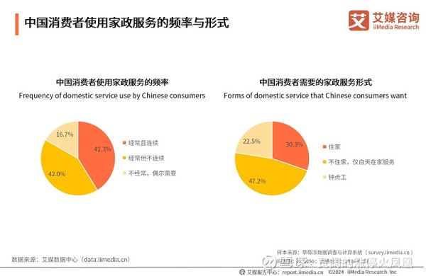 iiMedia Research(艾媒咨询)数据显示,42.0%中国消费者会经常但不连续地雇用家政服务人员,47.2%中国消费者需要仅白天在家服务的不住家服务形式。艾媒咨询分析师认为,在工作繁忙与育幼、养老的矛盾下,中国消费者使用家政服务频率较高,越来越多的家庭具备了购买社会化家政服务的条件,家政服务业释放出巨大的需求。