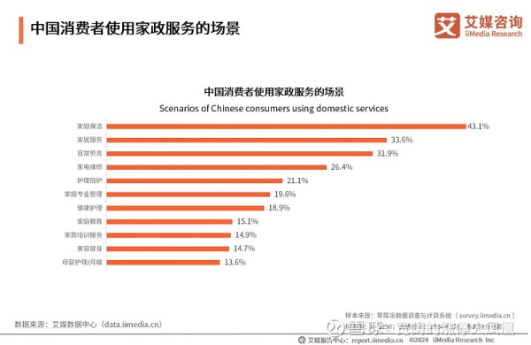 iiMedia Research(艾媒咨询)数据显示,家庭保洁是中国消费者最常使用家政服务的场景,占比达到43.1%。此外,家居服务、日常劳务也是家政服务消费的热门项目,占比均超三成。艾媒咨询分析师认为,从消费场景来看,消费者对家庭保洁、家居服务(收纳、搬家、家电安装等)及日常劳务的需求最为强烈,家电维修成为继保洁、家居服务、日常劳务之外的又一热门项目,推动着行业在细分领域的创新与升级。