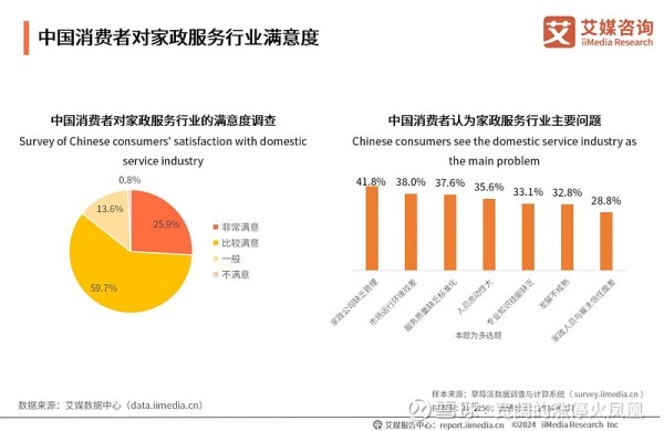 iiMedia Research(艾媒咨询)数据显示,59.7%的中国消费者对家政服务行业表示比较满意,表示不满意的消费者占比不足1.0%。中国消费者认为家政服务行业存在的主要问题是家政公司缺乏管理。艾媒咨询分析师认为,家政公司管理不规范,十分不利于市场及人员管理的规范化,容易造成行业混乱。