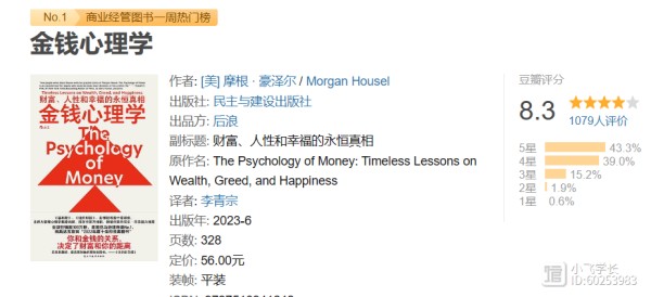 这两年有本常被众人提起的书籍,它就是摩根·豪泽尔的《金钱心理学》。关于对待钱的态度,对待理财的原则,对待金钱的心理等。本书电子档已经在笔者的读书营中分享,感兴趣的读者朋友可私聊,入群即可查看。