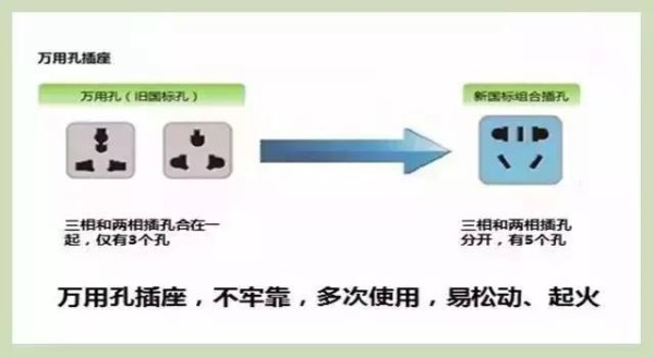 4.万用孔插座真是太危险了,容易引起短路、火灾和触电危险,如果您家有的话,要记得及时更换,您可以选择有5个孔的新国标组合插座。