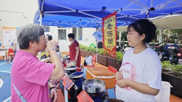 农副产品摊位同样受欢迎。几大缸江西老陈醋散发着浓郁醋香,居民们凑近闻着判断是否为正宗好货;嘉定江桥手工粽子买十个送一个,不少居民围着挑选;鸡蛋、五花腊肉、精制鱼干、梅菜笋丝等也备受青睐。