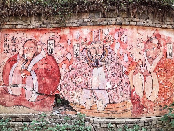 三宝村的彩绘风景是另一大看点,黄泥巴墙上涂满各路神仙的壁画。陶神、风神、窑神、酒神、茶神……果然是神仙般的地方。他们都是来自艺术家文那的手笔,如今她的壁画已经散见国内外多地,而三宝村则是她创作最早起步的地方。
