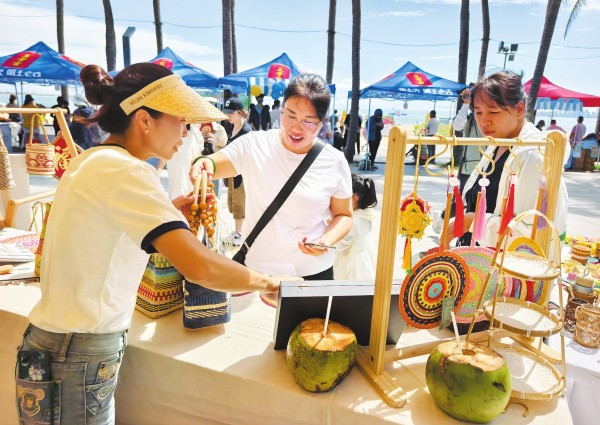 5月31日,在秀英区火山荔枝季农文旅市集上,游人正在挑选精美的东山草编。记者 石中华 摄