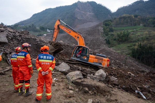 2月10日,武警第二机动总队某支队大型救援装备与武警四川总队宜宾支队官兵协同配合,在筠连县山体滑坡现场搜救。新华社发(郑磊 摄)