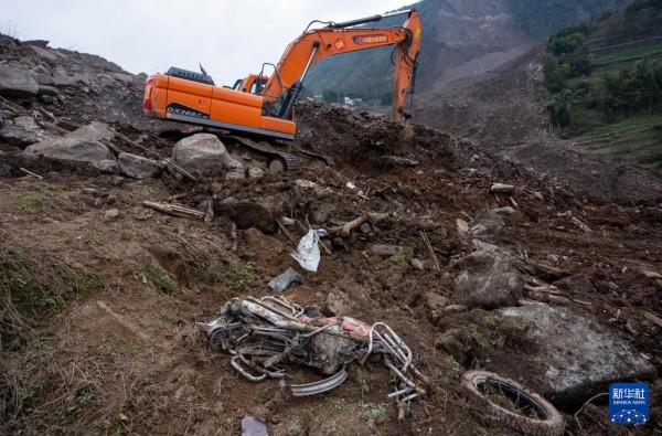 2月10日,山体滑坡现场,挖掘机正在清理废墟。新华社记者 江宏景摄