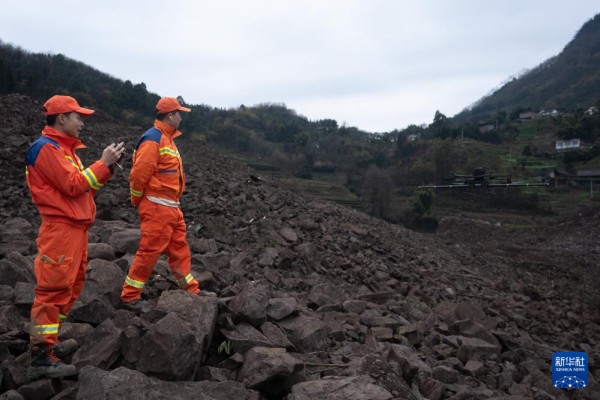 2月10日,在山体滑坡现场,应急管理部上海消防研究所工作人员操控无人机进行监测。新华社记者 江宏景 摄