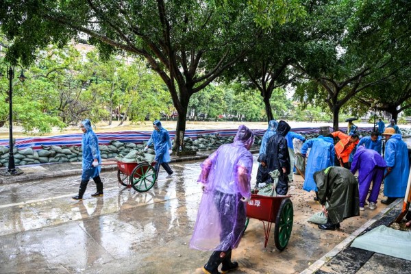 10月7日,广西百色市德保县的工作人员在抢运沙袋加固河道防洪堤。新华社记者 曹祎铭 摄