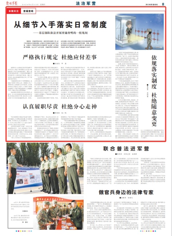 “机关督导基层落实各项工作应当科学依法、有章可循,不能为图自己方便干扰基层执勤等重要工作。”该团党委以此事为契机,专门组织机关和基层官兵学习相关条令法规,明确查铺查哨的内容和检查重点。结合具体实践,他们梳理总结夜间重要点位及易出现的安全问题清单,下发给干部和执勤人员。