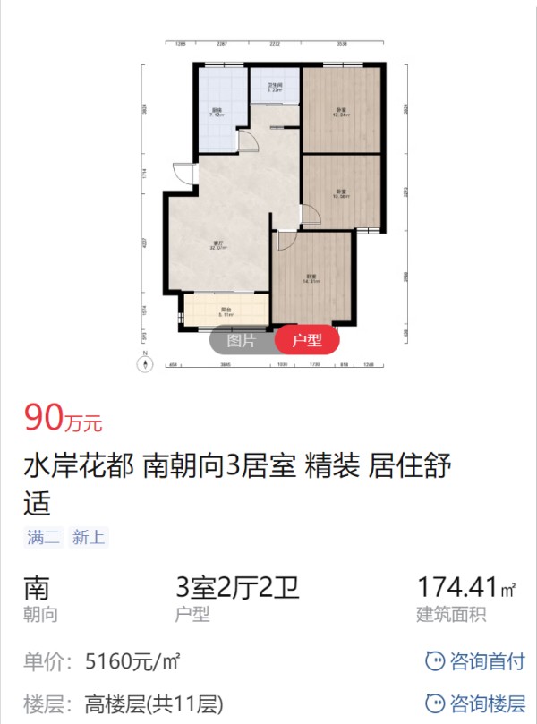 水岸花都位于油港路,属于滨江CBD板块,周边配套齐全,没有后顾之忧。这套房源为南向三居室,主卧、客厅、次卧朝南,客厅带阳台,室内采光明亮。户型方正,南北通透,通风效果高。业主精心装修,保养很好,可以拎包入住。