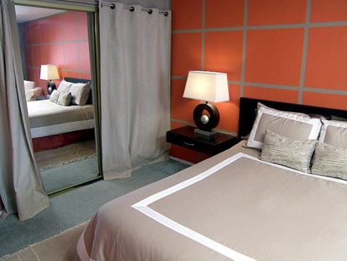【镜子】在家装设计中,最简单的装修技巧之一就是添加一个全身镜,这样可以从视觉上扩大空间。像这间卧室中的镜子被窗帘环绕,无形中增加了空间的尺寸,关上窗帘也能够将镜子隐藏起来。