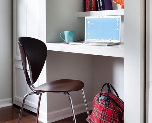 【角落书房】在设计卧室时不要让多余的空间闲置,可以将角落处设计成一个小书房,在墙面上设置置物隔板,搭配一张嵌入式书桌,就成了一个小小的书房。