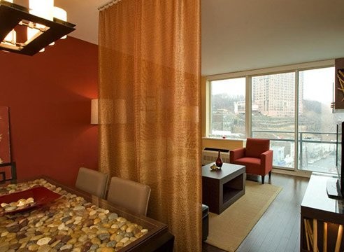 【窗帘隔断】在空间布局中,两个空间之间会进行隔断,像墙面隔断和收纳隔断等都是比较占用空间的。但是在这个客餐厅中采用了丝质纱帘进行隔断,既轻松又方便。