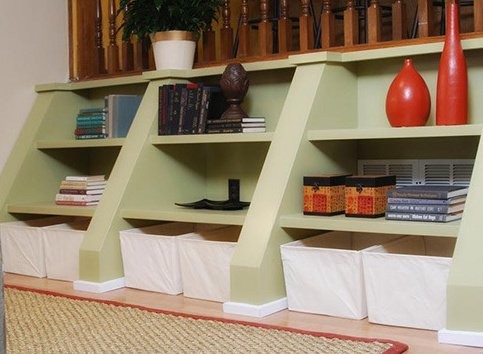 【创意收纳】创造性地利用两个楼层之间的额外空间来放置一个独特的书架,无论是在收纳功能上还是装饰效果上都很精妙。在储物架和地面之间的空间放上小帆布箱,可以用来收纳一些小物件同时也不会显得杂乱。