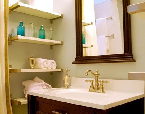 【浴室存储】浴室的空间都比较小,但是狭窄的壁架确是一个很好的设计。在架子上摆放一些漂亮的瓶瓶罐罐,其他不常用的东西就可以收纳在浴室柜中。