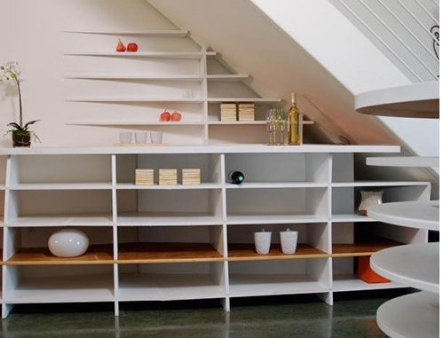 【楼梯空间】很多家庭中会有楼梯,那么楼梯下的空间也可以利用起来。在楼梯下放置一个架子,如果与厨房连在一起还能变成一个迷你小吧台,用来存储酒品和其他配件也很不错。