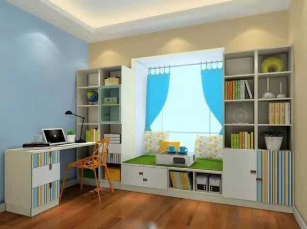 一体柜使用 传统:各自功能分开,占地面积大 新意:将多功能融合在一起,小巧精致 困难:依然是不好购买,或需要成套订制 儿童房内的衣柜内侧巧妙融进去一个书柜,转角区域自然而然打造成学习区。一个紧凑的直角空间就解决了两个空间使用问题。