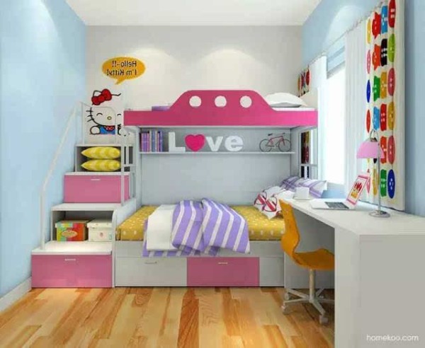 充满收纳的儿童房 ?扩容面积 传统:普通床铺 新意:双层加柜梯设计,增加储物功能 困难:需要多逛选到合适尺寸或订做 小孩子玩具、书本、娃娃等杂物过多,将下床设计成抽屉床,充分发挥了闲置空间的使用功能。同时,整个楼梯的阶梯就像4个小收纳箱拼搭而成,实用又可爱。二层的床铺,也可以容纳更多的人居住。从利用率上提升了空间面积。