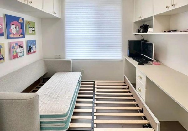 2)沙发底部抽拉床。特别是客厅,空间比较紧凑,对空间要求比较高,可以在沙发底部安装抽拉床。成本七八百元就可以解决,方便实用。