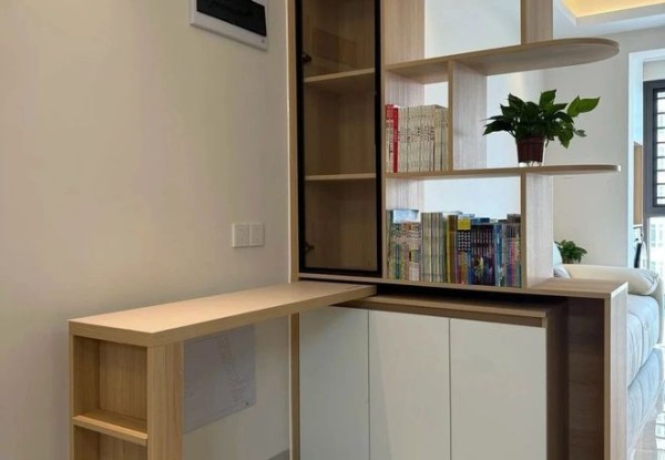1)折叠桌板,嵌入餐边柜。这是比较流行的一种方案,展开就可以形成1.8米的餐桌,还可以作为书桌、办公桌。折叠就只是一个餐边柜,平时通行也没有障碍。