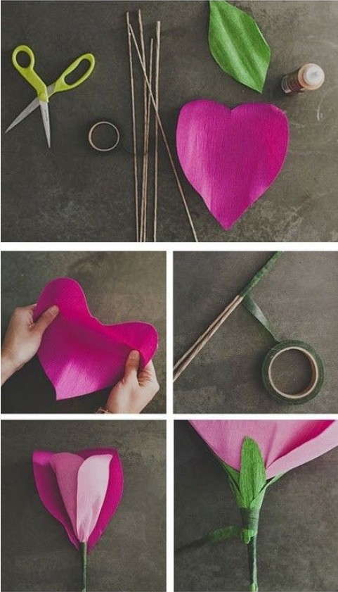 将花瓣按照大小依次排好,先挑出五个大花瓣,将底部粘在一起,然后找出稍微小一点的五个花瓣,粘在大花瓣的里面,按照这样的方法依次将小花瓣粘进去,一朵婚礼背景墙上的手工婚礼纸花就做好了。