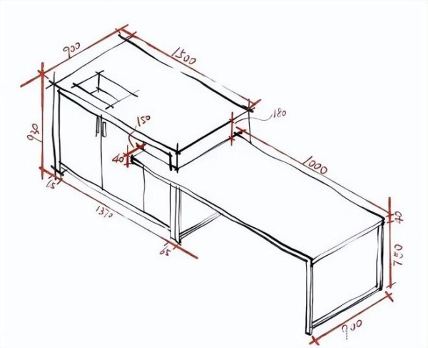 桌板的厚度建议为5cm,若窄则毫无体量感和质感。为了增强设计感,在餐桌岛台交界处通常会做侧插的设计,侧插出来的宽度长度40cm, 宽度15cm,这是比较舒适和常规的尺度。