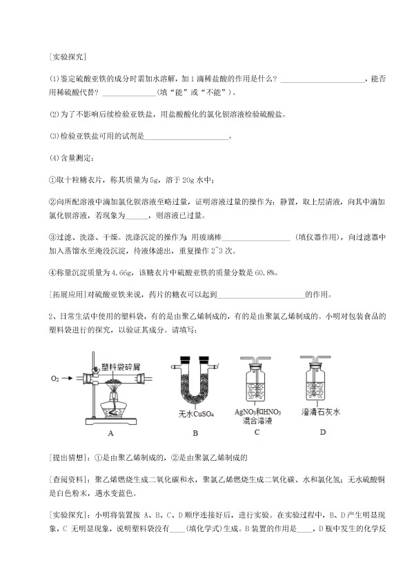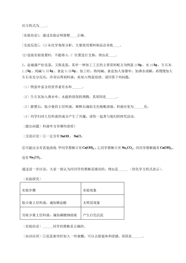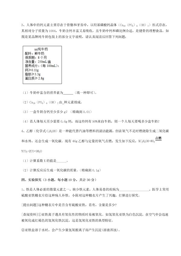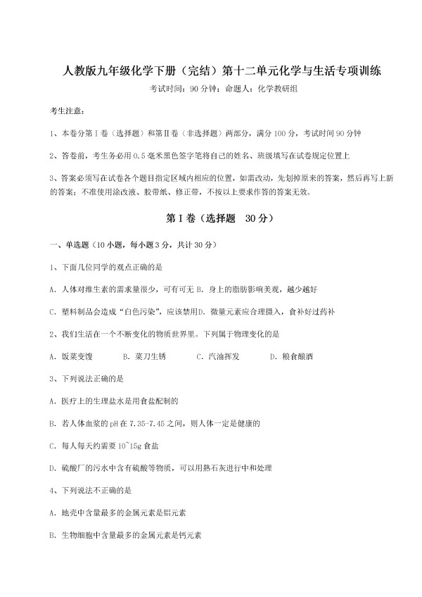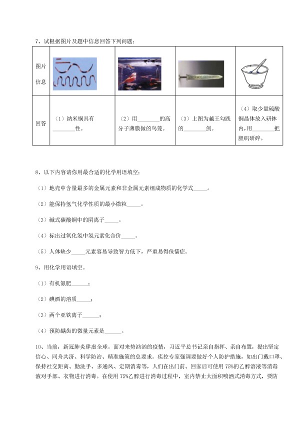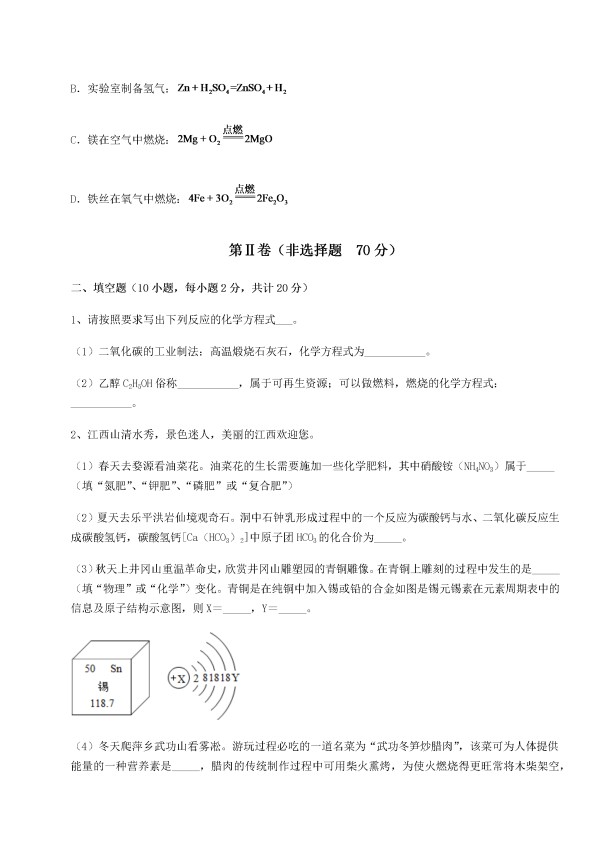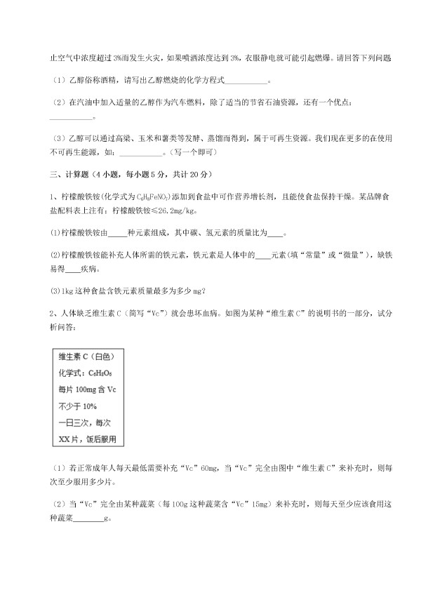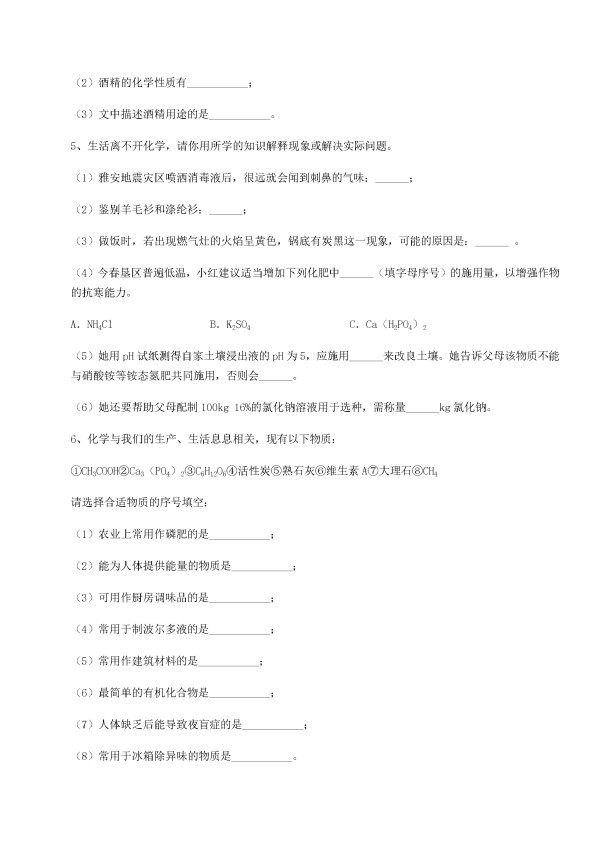 人教版九年级化学下册(完结)第十二单元化学与生活专项训练考试时间:90分钟;命题人:化学教研组考生注意:1、本卷分第I卷(选择题)和第Ⅱ卷(非选择题)两部分满分100分考试时间90分钟2、答卷前考生务必用0.5毫米黑色签字笔将自己的姓名、班级填写在试卷规定位置上3、答案必须写在试卷各个题目指定区域内相应的位置如需改动先划掉原来的答案然后再写上新的答案;不准使用涂改液、胶带纸、修正带不按以上要求作答的答案无效。第I卷(选择题30分)一、单选题(10小题每小题3分共计30分)1、下面几位同学的观点正确的是A.人体对维生素的需求量很少可有可无B.身上的脂肪影响美观越少越好C.塑料制品会造成“白色污染”应该禁用D.微量元素应合理摄入食补好过药补2、我们生活在一个不断变化的物质世界里。下列属于物理变化的是A.饭菜变馊B.菜刀生锈C.汽油挥发D.粮食酿酒3、下列说法正确的是A.医疗上的生理盐水是用食盐配制的B.若人体血浆的pH在7.35-7.45之间则人体一定是健康的C.每人每天约需要10~15g食盐D.硫酸厂的污水中含有硫酸等物质可以用熟石灰进行中和处理4、下列说法不正确的是A.地壳中含量最多的金属元素是铝元素B.生物细胞中含量最多的金属元素是钙元素C.把含有可溶性钙镁化合物的水称为硬水D.全球气候变暖、臭氧层破坏和酸雨等也与空气污染有关5、下列做法不正确的是A.合理摄入人体必需元素B.用二氧化硫熏蒸馒头使它更白C.使用可降解塑料餐盒D.用灼烧发鉴别合成纤维和羊毛纤维6、人体缺钙易引发的病症是A.食欲不振B.夜盲症C.骨质疏松D.甲状腺肿大7、下列生活中的做法不合理的是A.减少使用一次性塑料袋B.多乘公交车少坐私家车C.家用电器着火立即用水灭火D.保持自行车钢圈干燥以防锈8、分类法是学习化学的重要方法之一下列各组物质按单质、碱、盐、纯净物、混合物的顺序排列正确的是A.C60、氨水、硫酸钡、过磷酸钙、盐酸B.Mg、苛性钠、纯碱、胆矾、AgNO3溶液C.N2、碱石灰、CuSO4、葡萄糖、自来水D.生铁、CH3OH、石灰石、NaCl、波尔多液9、化学与生活、健康等紧密相关。下列说法错误的是A.加热煮沸可以软化硬水B.煤气泄漏立即开灯检查C.人体缺钙导致骨质疏松D.单车出行利于低碳环保10、下列叙述对应的化学方程式书写正确的是A.乙醇燃烧:B.实验室制备氢气:C.镁在空气中燃烧:D.铁丝在氧气中燃烧:第Ⅱ卷(非选择题70分)二、填空题(10小题每小题2分共计20分)1、请按照要求写出下列反应的化学方程式___。(1)二氧化碳的工业制法:高温煅烧石灰石化学方程式为___________。(2)乙醇C2H5OH俗称___________属于可再生资源;可以做燃料燃烧的化学方程式:___________。2、江西山清水秀景色迷人美丽的江西欢迎您。(1)春天去婺源看油菜花。油菜花的生长需要施加一些化学肥料其中硝酸铵(NH4NO3)属于_____(填“氮肥”、“钾肥”、“磷肥”或“复合肥”)(2)夏天去乐平洪岩仙境观奇石。洞中石钟乳形成过程中的一个反应为碳酸钙与水、二氧化碳反应生成碳酸氢钙碳酸氢钙[Ca(HCO3)2]中原子团HCO3的化合价为_____。(3)秋天上井冈山重温革命史欣赏井冈山雕塑园的青铜雕像。在青铜上雕刻的过程中发生的是_____(填“物理”或“化学”)变化。青铜是在纯铜中加入锡或铅的合金如图是锡元锡素在元素周期表中的信息及原子结构示意图则X=_____Y=_____。(4)冬天爬萍乡武功山看雾凇。游玩过程必吃的一道名菜为“武功冬笋炒腊肉”该菜可为人体提供能量的一种营养素是_____腊肉的传统制作过程中可用柴火熏烤为使火燃烧得更旺常将木柴架空原因是_____。3、学好化学可以帮助我们分析和解决生产、生活中的问题。(1)同样是金属为什么金属铝露置在空气中不容易被腐蚀_______?(2)“锅碗瓢盆”和“柴米油盐”其中包含着许多化学知识下列厨房用品的主要材料中属于金属材料的是(填代号)。A.塑料盆B.紫砂锅C.陶瓷碗D.不锈钢水瓢(3)小明奶奶点燃生日蛋糕蜡烛许愿后大家一起将蜡烛吹灭这种熄灭蜡烛火焰的原理是_______。(4)下列公共标志与消防安全有关的是。A.①③④B.②③④C.③④⑤D.①②③④⑤(5)有镁铜氧气盐酸。他们两两反应共能发生_____个反应。4、阅读下面科普短文并根据文章内容回答相关问题。a.酒精是一种无色透明的、具有特殊气味的液体;b.易挥发;c.能与水以任意比例互溶;d.酒精易燃烧燃烧时生成水和二氧化碳;e.常用作酒精灯和内燃机中的燃料是一种绿色能源。(1)保存酒精时需要密封是因为___________(填字母编号下同)。(2)酒精的化学性质有___________;(3)文中描述酒精用途的是_
