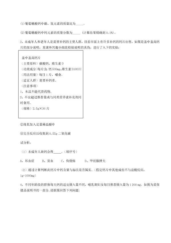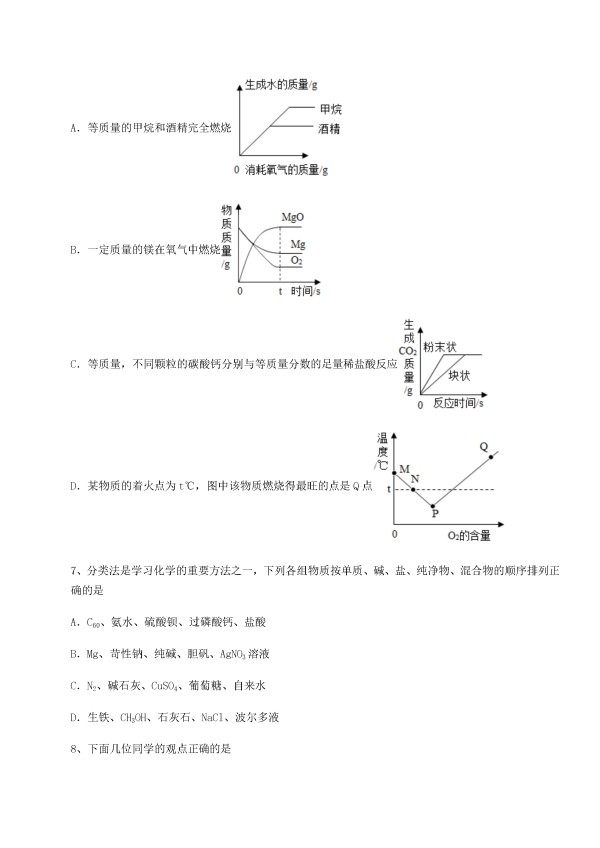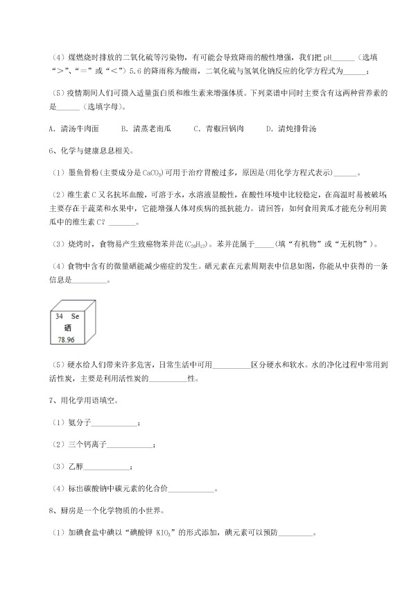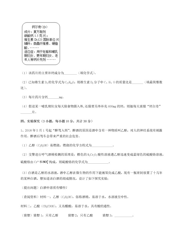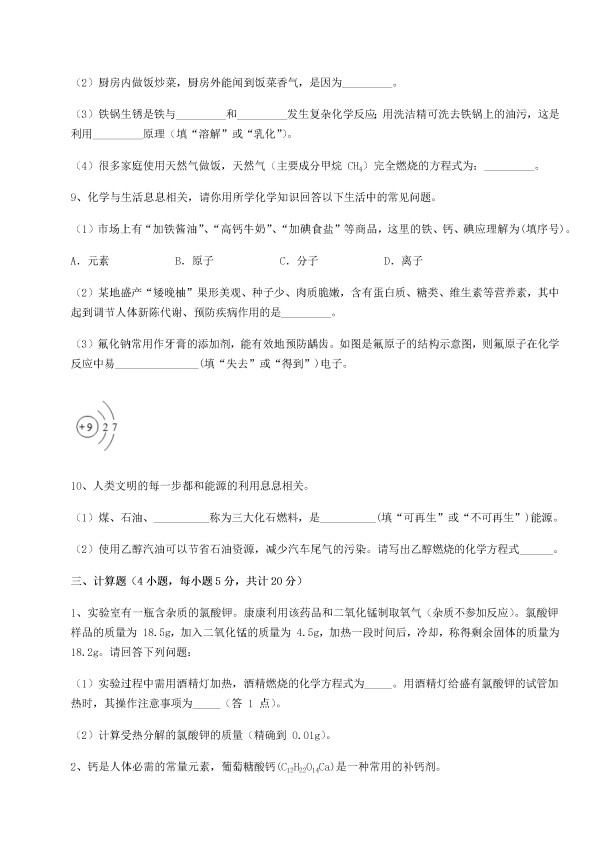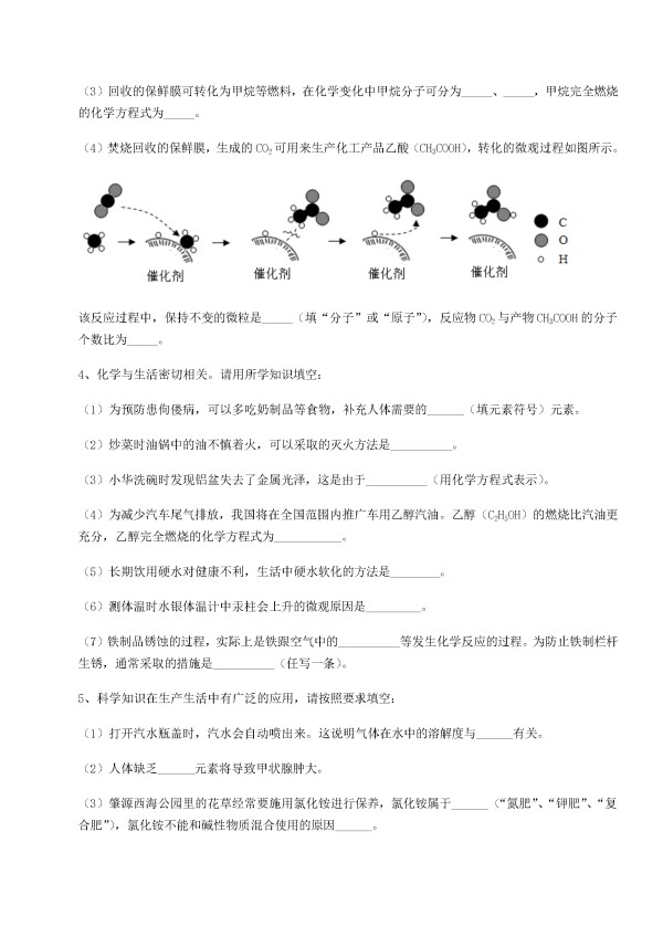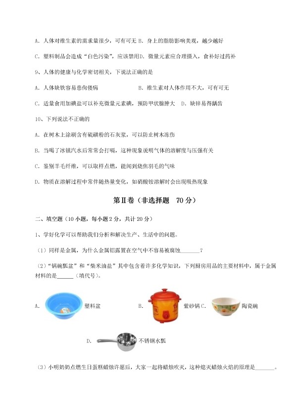 人教版九年级化学下册(完结)第十二单元化学与生活同步练习考试时间:90分钟;命题人:化学教研组考生注意:1、本卷分第I卷(选择题)和第Ⅱ卷(非选择题)两部分满分100分考试时间90分钟2、答卷前考生务必用0.5毫米黑色签字笔将自己的姓名、班级填写在试卷规定位置上3、答案必须写在试卷各个题目指定区域内相应的位置如需改动先划掉原来的答案然后再写上新的答案;不准使用涂改液、胶带纸、修正带不按以上要求作答的答案无效。第I卷(选择题30分)一、单选题(10小题每小题3分共计30分)1、柳州螺蛳粉风靡全国成为柳州的一张名片。螺蛳粉的成分表中富含蛋白质的是A.米粉B.酸笋C.腐竹D.青菜2、北京冬奥会将于2022年2月4日开幕。本届冬奥会火炬“飞扬”采用氢气作为燃料由碳纤维及其复合材料制成的外壳和燃烧罐破解了火炬外壳在1000℃高温制备过程中起泡、开裂等难题火炬呈现“轻、固、美”的特点下列说法错误的是A.燃烧时的碳排放为零B.碳纤维复合材料与相同体积的铝合金相比轻C.这一材料具有高强度、耐腐蚀、耐高温等特点D.火炬燃烧罐以碳纤维材质为主所以碳不能燃烧3、下列表述完全正确的是①降低温度溶质质量分数一定减小。②由同种元素组成的纯净物一定为单质。③玻璃钢属于复合材料④用无色酚酞可以检测氢氧化钠溶液是否变质。⑤盐和盐盐和碱发生反应时一定有沉淀生成。⑥碘摄入过量会导致甲状腺肿大。⑦用pH试纸测得稀硫酸的是pH=4.5.⑧在金属活动性顺序表中位于前面的金属单质一定能把后面的金属从它们的盐溶液中置换出来⑨实验室用10%的氯化钠溶液配制5%的氯化钠溶液量取10%的氯化钠溶液时仰视读数若其他操作均正确则所配溶液中溶质的质量分数小于5%A.②③⑤⑥B.②③⑥C.②③⑤⑥⑨D.②⑤⑥⑧4、下列说法或做法正确的是A.青少年缺硒这种微量元素会引起食欲不振生长迟缓发育不良B.2019世界能源大会把核能作为含碳能源重要替代品核电站把化学能转化为电能C.DAC法能够实现直接从空气中捕获二氧化碳该法可缓解全球严重的温室效应D.厕所清洁剂与炉具清洁剂能混用5、“中国高铁世界第一”。高铁列车车体材料使用了含镍(niè)的不锈钢工业上火法炼镍原理是:C+2NiO2Ni+CO2↑。下列是对上述信息的一些说法其中错误的是A.反应中NiO发生了还原反应B.气体产物中可能存在COC.该不锈钢中还含有碳D.该不锈钢是一种新型的化合物6、下列图象不能正确反映相关实验过程中量的变化的是A.等质量的甲烷和酒精完全燃烧B.一定质量的镁在氧气中燃烧C.等质量不同颗粒的碳酸钙分别与等质量分数的足量稀盐酸反应D.某物质的着火点为t℃图中该物质燃烧得最旺的点是Q点7、分类法是学习化学的重要方法之一下列各组物质按单质、碱、盐、纯净物、混合物的顺序排列正确的是A.C60、氨水、硫酸钡、过磷酸钙、盐酸B.Mg、苛性钠、纯碱、胆矾、AgNO3溶液C.N2、碱石灰、CuSO4、葡萄糖、自来水D.生铁、CH3OH、石灰石、NaCl、波尔多液8、下面几位同学的观点正确的是A.人体对维生素的需求量很少可有可无B.身上的脂肪影响美观越少越好C.塑料制品会造成“白色污染”应该禁用D.微量元素应合理摄入食补好过药补9、人体的健康与化学密切相关下说法正确的是A.人体缺铁容易患佝偻病B.维生素对人体作用不大可有可无C.适量食用加碘盐可以补充微量元素碘预防甲状腺肿大D.缺锌易得龋齿10、下列说法不正确的A.在树木上涂刷含有硫磺粉的石灰浆可以防止树木冻伤B.当喝了冰镇汽水后常常会打嗝这种现象说明气体的溶解度与压强有关C.鉴别羊毛纤维可以取样点燃能闻到烧焦羽毛的气味D.物质在溶解过程中常伴随热量变化如硝酸铵溶解时会出现吸热现象第Ⅱ卷(非选择题70分)二、填空题(10小题每小题2分共计20分)1、学好化学可以帮助我们分析和解决生产、生活中的问题。(1)同样是金属为什么金属铝露置在空气中不容易被腐蚀_______?(2)“锅碗瓢盆”和“柴米油盐”其中包含着许多化学知识下列厨房用品的主要材料中属于金属材料的是(填代号)。A.塑料盆B.紫砂锅C.陶瓷碗D.不锈钢水瓢(3)小明奶奶点燃生日蛋糕蜡烛许愿后大家一起将蜡烛吹灭这种熄灭蜡烛火焰的原理是_______。(4)下列公共标志与消防安全有关的是。A.①③④B.②③④C.③④⑤D.①②③④⑤(5)有镁铜氧气盐酸。他们两两反应共能发生_____个反应。2、请用化学用语回答下列问题(1)2个钠离子______。(2)标出氯酸钾中氯元素的化合价______。(3)最简单的有机物是______。3、塑料制品为人类带来便利的同时也造成了环境问题。科研人员为此提出多种解决方案。(1)塑料的回收再利用意义重大。下列属于回收标志的是_____(填标号)。A.B.C.D.(2)科学家用纤