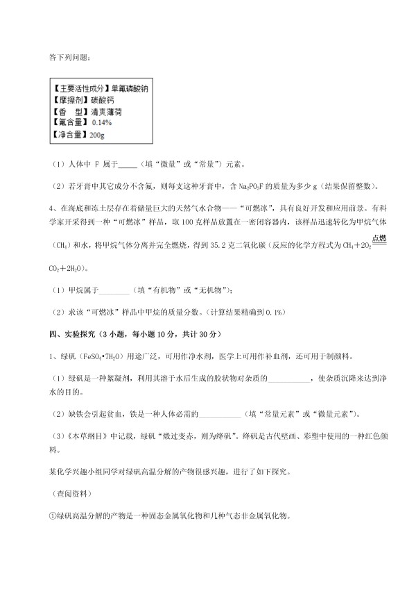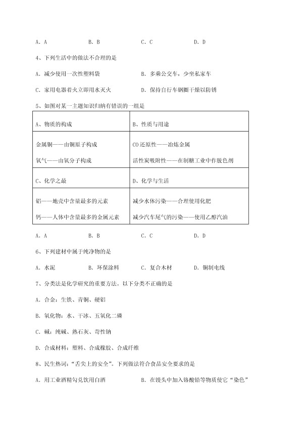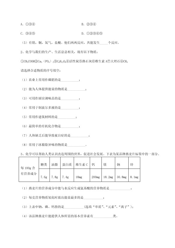 人教版九年级化学下册(完结)第十二单元化学与生活专题训练考试时间:90分钟;命题人:化学教研组考生注意:1、本卷分第I卷(选择题)和第Ⅱ卷(非选择题)两部分满分100分考试时间90分钟2、答卷前考生务必用0.5毫米黑色签字笔将自己的姓名、班级填写在试卷规定位置上3、答案必须写在试卷各个题目指定区域内相应的位置如需改动先划掉原来的答案然后再写上新的答案;不准使用涂改液、胶带纸、修正带不按以上要求作答的答案无效。第I卷(选择题30分)一、单选题(10小题每小题3分共计30分)1、柳州螺蛳粉风靡全国成为柳州的一张名片。螺蛳粉的成分表中富含蛋白质的是A.米粉B.酸笋C.腐竹D.青菜2、民以食为天。下列说法不正确的是A.霉变的大米中含有黄曲霉毒素不能食用B.生活中常见的汽水、牛奶、冰水均属于溶液C.人体缺钙容易导致骨质疏松易得佝偻病D.在食用皮蛋时可以蘸点食醋以中和皮蛋中含有的少量碱性物质3、下列做法及叙述正确的是A化学与生活用甲醛溶液浸泡海产品保鲜B化学与农业铵态氮肥不能与碱性物质混用C化学与安全浓硫酸沾在皮肤上涂NaOH溶液D化学与环保空气污染指数越高空气质量越好A.AB.BC.CD.D4、下列生活中的做法不合理的是A.减少使用一次性塑料袋B.多乘公交车少坐私家车C.家用电器着火立即用水灭火D.保持自行车钢圈干燥以防锈5、如图对某一主题知识归纳有错误的一组是A、物质的构成B、性质与用途金属铜——由铜原子构成氧气——由氧分子构成CO还原性——冶炼金属活性炭吸附性——在制糖工业中作脱色剂C、化学之最D、化学与生活铝——地壳中含量最多的元素钙——人体中含量最多的金属元素减少水体污染——合理使用化肥减少汽车尾气的污染——使用乙醇汽油A.AB.BC.CD.D6、下列建材中属于纯净物的是A.水泥B.环保涂料C.复合木材D.铜制电线7、分类法是化学研究的重要方法。以下分类不正确的是A.合金:生铁、青铜、硬铝B.氧化物:水、干冰、五氧化二磷C.碱:纯碱、熟石灰、苛性钠D.合成材料:塑料、合成橡胶、合成纤维8、民生热词:“舌尖上的安全”。下列做法符合食品安全要求的是A.用工业酒精勾兑饮用白酒B.在馒头中加入铬酸铅等物质使它“染色”C.用亚硝酸钠代替食盐烹调食物D.凉拌黄瓜加食醋有利于维生素C的吸收9、下列用品不属于有机合成材料的是A.尼龙伞布B.塑料牙刷C.玻璃水杯D.橡胶轮胎10、人体中含量最多的元素是A.氢B.氧C.碳D.钙第Ⅱ卷(非选择题70分)二、填空题(10小题每小题2分共计20分)1、学好化学可以帮助我们分析和解决生产、生活中的问题。(1)同样是金属为什么金属铝露置在空气中不容易被腐蚀_______?(2)“锅碗瓢盆”和“柴米油盐”其中包含着许多化学知识下列厨房用品的主要材料中属于金属材料的是(填代号)。A.塑料盆B.紫砂锅C.陶瓷碗D.不锈钢水瓢(3)小明奶奶点燃生日蛋糕蜡烛许愿后大家一起将蜡烛吹灭这种熄灭蜡烛火焰的原理是_______。(4)下列公共标志与消防安全有关的是。A.①③④B.②③④C.③④⑤D.①②③④⑤(5)有镁铜氧气盐酸。他们两两反应共能发生_____个反应。2、化学与我们的生产、生活息息相关现有以下物质:①CH3COOH②Ca3(PO4)2③C6H12O6④活性炭⑤熟石灰⑥维生素A⑦大理石⑧CH4请选择合适物质的序号填空:(1)农业上常用作磷肥的是___________;(2)能为人体提供能量的物质是___________;(3)可用作厨房调味品的是___________;(4)常用于制波尔多液的是___________;(5)常用作建筑材料的是___________;(6)最简单的有机化合物是___________;(7)人体缺乏后能导致夜盲症的是___________;(8)常用于冰箱除异味的物质是___________。3、化学可以帮助人类认识改造周围的世界促进社会发展。下表为某品牌燕麦片标签中的一部分。每100g含有营养成分糖类油脂蛋白质维生素C钙镁钠锌7.6g7.8g7.4g18mg200mg18.2mg30.8mg8.1mg(1)燕麦片的营养成分中能与水反应生成氨基酸的营养物质是_____________;(2)每克营养物质氧化时放出能量最多的是____________;(3)上表中钠、磷、钙指的是____________(选填“单质”、“元素”、“离子”);(4)该品牌燕麦片能提供人体所需的基本营养素有____________类。4、请按照要求写出下列反应的化学方程式___。(1)二氧化碳的工业制法:高温煅烧石灰石化学方程式为___________。(2)乙醇C2H5OH俗称___________属于可再生资源;可以做燃料燃烧的化学方程式:___________。5、用化学用语填空