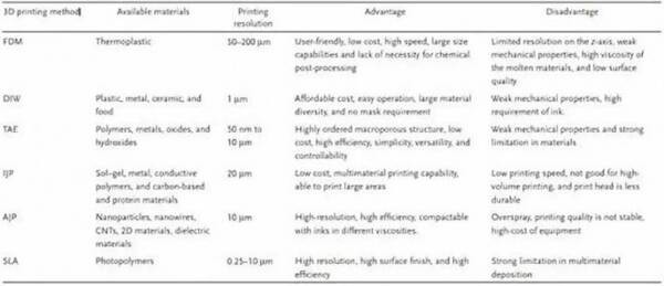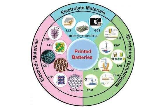 制造电池的主要3D打印技术包括:立体光固化(SLA),模板沉积(template-assisted electrodeposition-based 3D printing,TAE),喷墨打印(inkjet printing,IJP),直接墨水书写( direct ink writing,DIW),熔融沉积成形(FDM)和气溶胶喷射( aerosol jet printing,AJP)。材料包括印刷电极材料石墨烯、碳纳米管、碳纳米纤维和LTO / LFP,以及电解质材料。