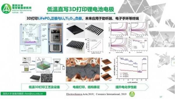 根据魔猴网的市场观察,我国研究机构也在开展3D打印电池技术的应用研究。例如,深圳大学增材制造研究对低温直写3D打印制造锂电池电极的制造进行了研究,3D打印LiFePO4正极与Li4Ti5O12负极,未来可应用于助听器、电子手环等终端。