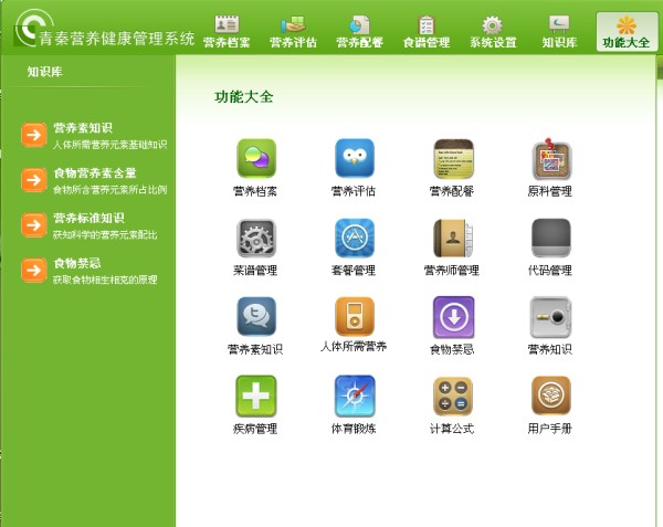 营养档案、营养评估、配餐管理、食谱管理、原料管理、运动管理、疾病管理、营养知识、膳食营养分析、营养报告、知识库管理、系统管理等模块。