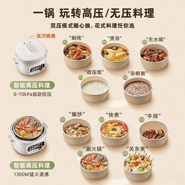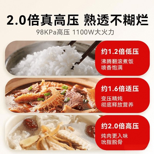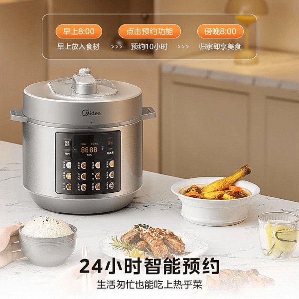 全自动智能预约:采用智能预约系统,轻松设定烹饪时间。打造高效的厨房体验,让您在忙碌中也能品尝美味佳肴,无需花费过多精力去操控,送上贴心的烹饪服务。 304不锈钢内胆:高品质304不锈钢设计,充分保证食材的安全与健康。此材料具备优良的耐腐蚀性,确保食物原汁原味,同时便于清洗,满足家庭日常使用需求。 270kPa高压烹饪:强劲的270kPa高压功能,大幅提升烹饪效率。无论是肉类还是谷物,都能快速出锅,且保留食材的营养,尽情享受丰富的家庭聚餐。 多区分区功能:灵活的分区功能满足多种烹饪需求。无需担心不同食材的搭配,贡献信息清晰的调理,不同口感的同时呈现,为家人带来多样化的饮食选择。美的电压力锅采用先进的五重安全保护设计,为用户提供安全可靠的烹饪体验。其一键式操作界面配合多种烹饪模式,既适合快节奏生活,也适合追求健康饮食的人群。此外,产品注重节能环保,帮助用户降低厨房能耗。